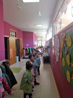 A través das noticias que trouxemos puidemos saber que a balea medía cerca duns 20m e queríamos saber canto era iso... Como é moi difícil imaxinar canto de largo son eses metros fomos unindo anacos de lá de 1m cada un! Case nos fai falta todo o corredor!